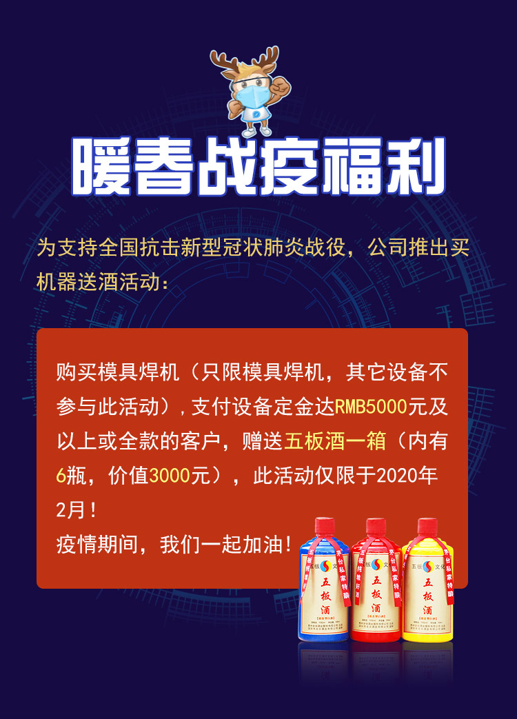 新型冠狀肺炎戰(zhàn)役福利——買(mǎi)通發(fā)激光模具焊接機(jī)送五板酒