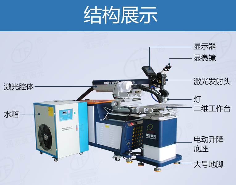 通發(fā)激光一體式模具激光焊機(jī)TFL-200YT/TFL-400YT是一款多種功能融合一體的新型模具激光焊接機(jī),針對(duì)特大型塑料模具激光焊、中型注塑模具激光燒焊、小型塑膠模具激光補(bǔ)焊、壓鑄模激光補(bǔ)焊具等各類模具可實(shí)現(xiàn)超精密修復(fù),幫您解決大型汽車模具修復(fù)難題,不需要模具移動(dòng),電動(dòng)工作臺(tái)與立體旋轉(zhuǎn)激光頭完美結(jié)合,操作桿控制運(yùn)動(dòng)移動(dòng)實(shí)現(xiàn)輕松激光修復(fù)大型模具,同時(shí)也保留了傳統(tǒng)手動(dòng)工作臺(tái)超精密修復(fù)模具功能。